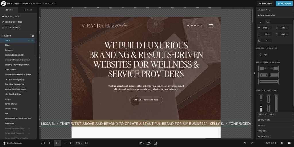 Another key advantage of Showit is its design-centric approach. Users have complete control over the placement of every element, offering a blank canvas where creativity can truly flourish. Unlike template-based builders, Showit doesn’t restrict you to pre-defined layouts, enabling the creation of unique and customized websites. This level of control is particularly beneficial for creatives who need their websites to stand out and make a lasting impression on visitors.